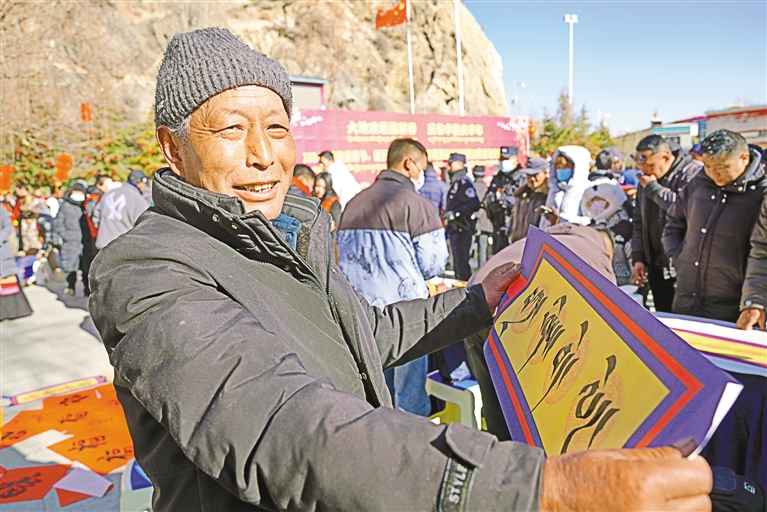山南市文聯組織書法家走進瓊結縣,開展“我們的中國夢——文化進萬家”活動。圖為群眾展示獲贈的藏文書法作品。