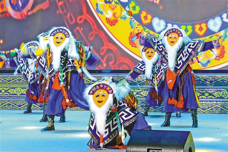 洛扎縣組織縣藝術團、農牧民表演隊等精心舉辦“大地歡歌 美麗洛扎”村晚。圖為村晚上的藏戲表演。