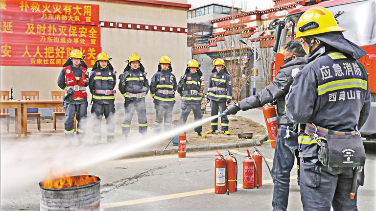 乃東區消防救援大隊來到乃東街道貢康社區,組織駐村工作隊、網格員、群眾開展消防應急演練,進一步提升群眾火災防范意識和應急處置能力。圖為消防員正在指導群眾進行滅火實操。