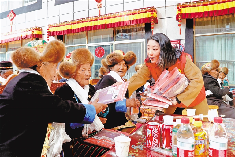 山南市瓊結縣各單位在縣集中供養中心聯合舉辦慶元宵活動,為供養中心老人分發保暖衣物。記者 洛桑 本報通訊員 次仁龍布 攝