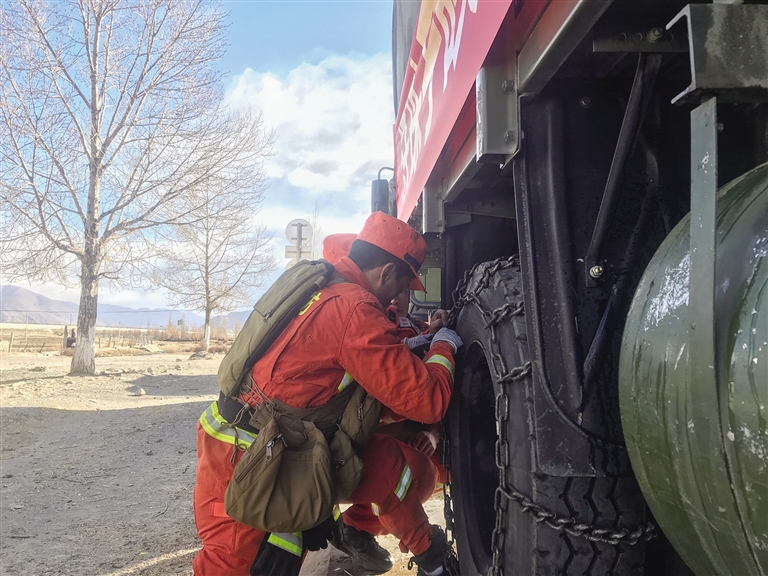 指戰員們進行車輛防滑安裝考核。記者 桑旦歐珠 攝