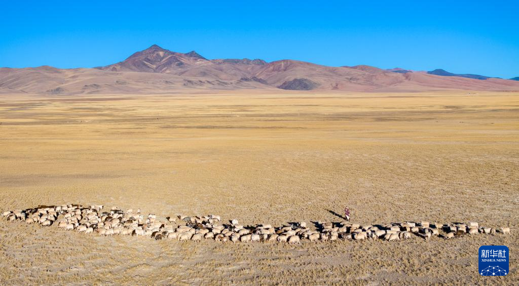 丹增在尼瑪縣俄久鄉(xiāng)馬遷村老家的草場上牧羊(無人機照片,2023年12月18日攝)。新華社 姜帆 攝