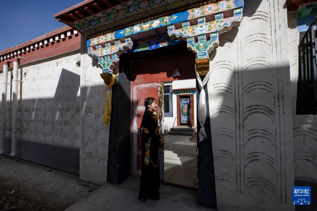 丹增在森布日生態(tài)搬遷安置點的新家門前(2024年1月24日攝)。新華社 姜帆 攝