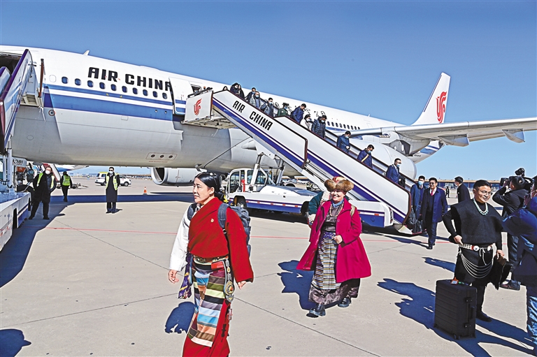 3日下午,出席十四屆全國人大二次會議的西藏全國人大代表、出席全國政協十四屆二次會議的住藏全國政協委員乘機抵達首都北京,正式開啟“兩會時間”。