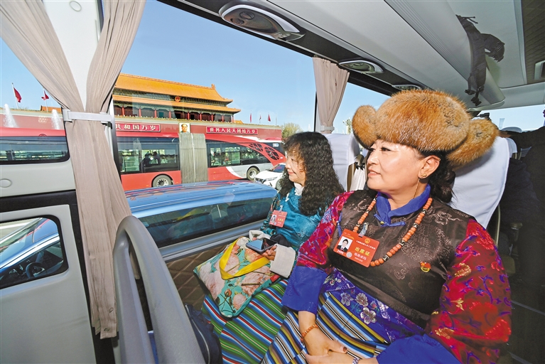 圖為人大代表們在前往駐地的途中經過天安門。記者 旦增西旦 攝