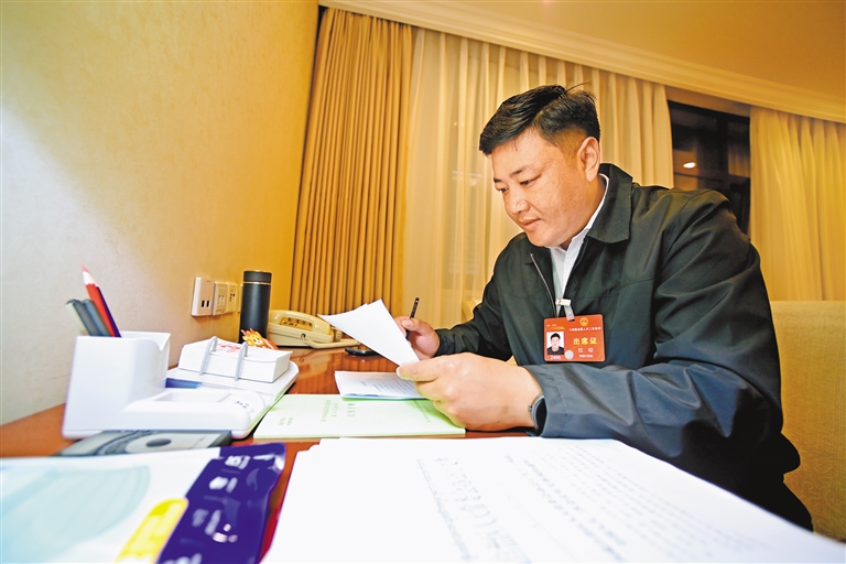 圖為全國人大代表拉瓊在會前完善發言材料。