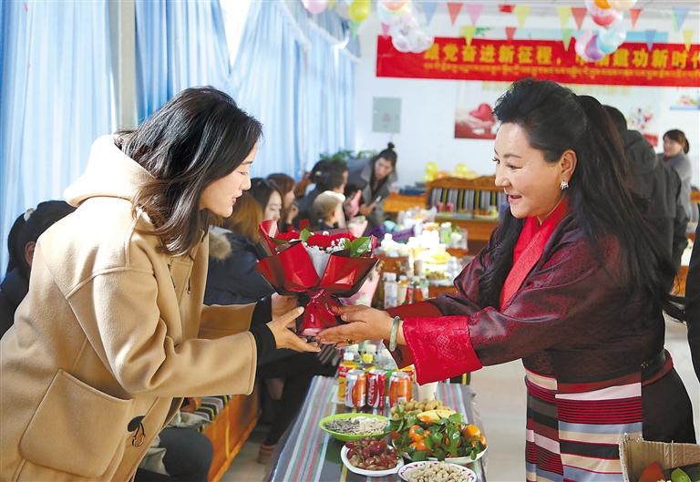 “三八”國際勞動婦女節來臨之際,山南市瓊結縣中心醫院組織醫院婦女職工一起慶祝節日。圖為瓊結縣中心醫院院長巴桑潘多(右)為醫院婦女職工獻上鮮花。 倫珠澤仁 洛桑 攝