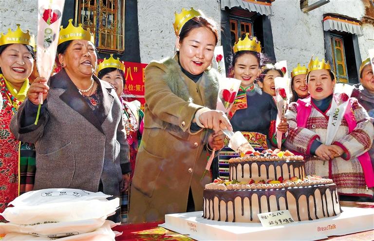 為進一步豐富社區婦女同胞的精神文化生活,展示社區巾幗風采,3月8日,拉薩市策門林社區和藥王山社區共同舉辦了“巾幗心向黨 奮進新征程‘三八’國際勞動婦女節”活動,轄區婦女歡聚一堂,慶祝節日。圖為轄區女性共同切蛋糕慶祝節日。 旦增蘭澤 攝