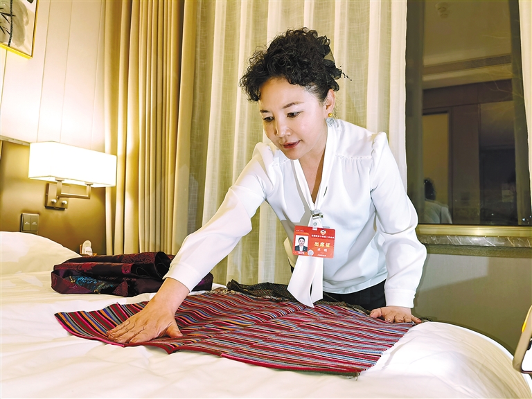 住藏全國政協委員卓嘎在駐地整理民族服裝。