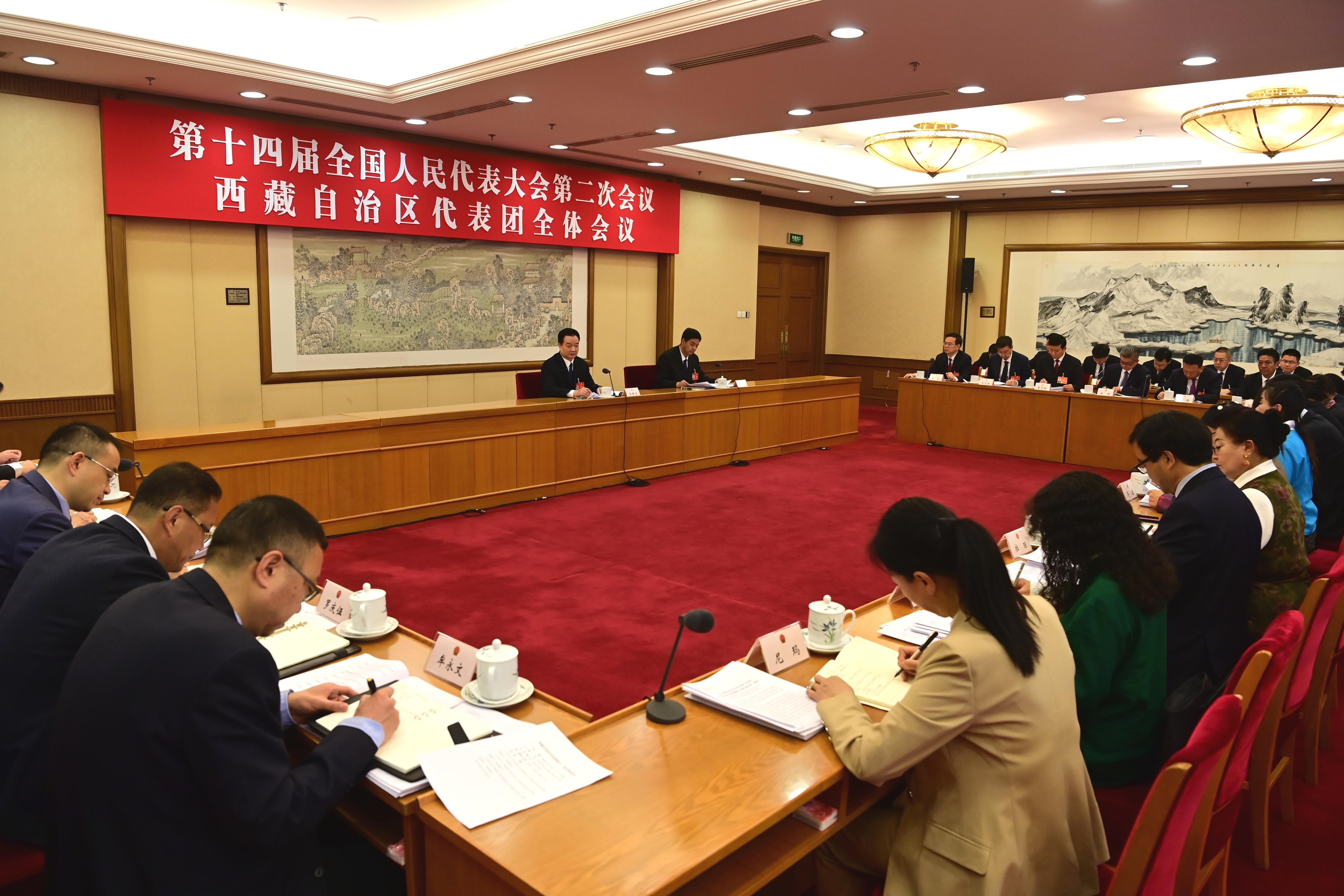 3月11日,西藏代表團舉行全體會議,審議關于全國人大常委會工作報告、最高人民法院工作報告、最高人民檢察院工作報告的決議草案。這是會議現場。記者 旦增西旦 攝
