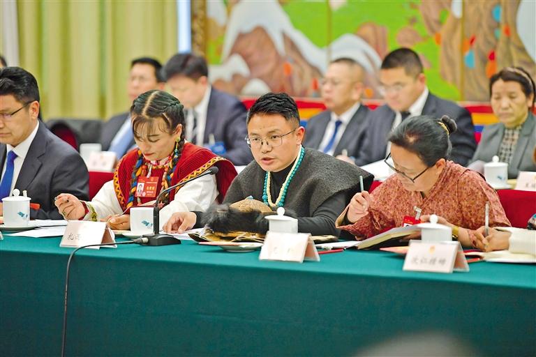 圖為西藏全國人大代表扎西江村(右)在西藏代表團全體會議上發言。旦增西旦 攝