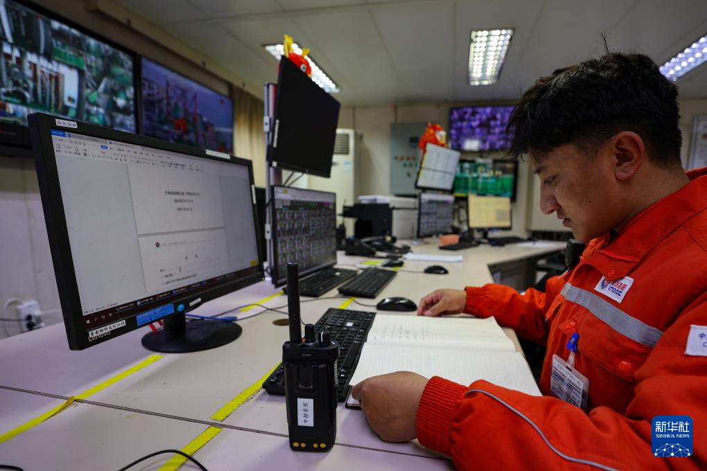 強巴在秦皇島32-6油田“渤海世紀號”(FPSO)16萬噸級浮式生產儲油裝置上的中央控制室進行參數核對和調整(3月7日攝)。新華社記者 姜帆 攝