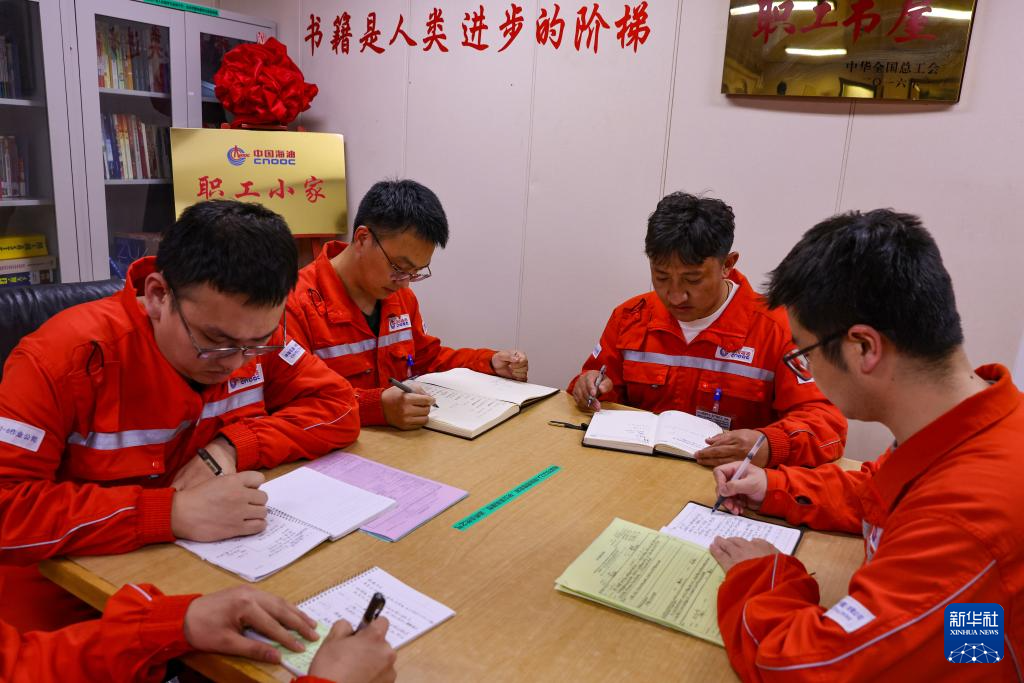 強巴在秦皇島32-6油田“渤海世紀號”(FPSO)16萬噸級浮式生產儲油裝置上休班的時候進行業務學習(3月7日攝)?,F在他正準備中級操作工資格的考試。新華社記者 姜帆 攝