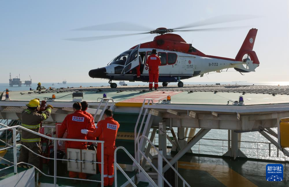 直升機在秦皇島32-6油田“渤海世紀號”(FPSO)16萬噸級浮式生產儲油裝置上降落(3月7日攝)。這是海上石油工人經常使用的交通工具。新華社記者 黃耀漫 攝