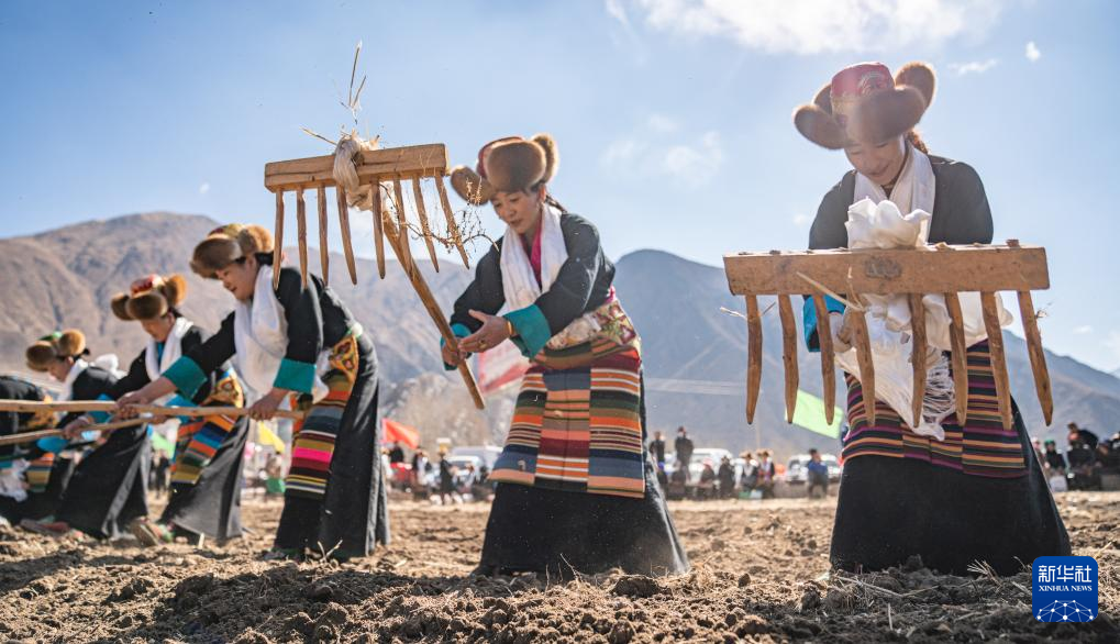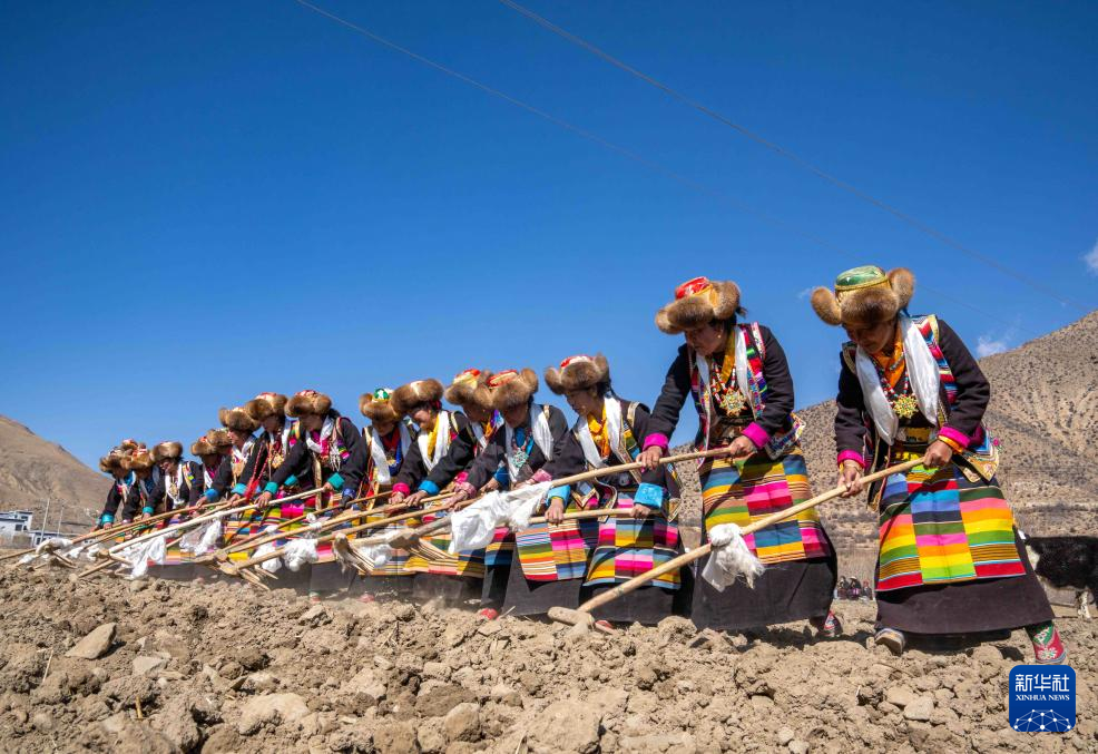 當日是西藏農民舉行一年一度春耕大典的日子。村民沿襲著傳承千年的春耕民俗,身著節日盛裝,手捧“切瑪”(五谷豐登斗),唱起祈愿歌,互敬青稞酒。當鐵犁翻開土地,婦女將手中的種子撒下,祈求新的一年豐收。