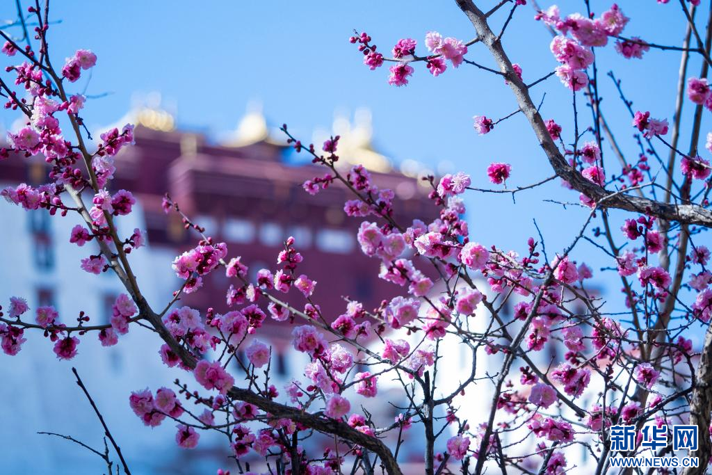 3月15日,杏花映襯下的布達拉宮。新華網 旦增努布 攝