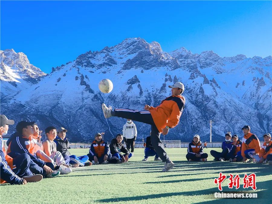 2022年11月25日,西藏那曲市嘉黎縣中學的高原球場上學生們在進行足球訓練。據了解,這座海拔4500米的高原球場是全校2500余名學生上體育課的地方,也是訓練足球的場地。色曲多吉 攝