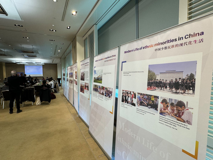 3月14日,由中國人權研究會主辦的“現代化發展中的少數民族受教育權——以中國西藏和新疆為例”主題邊會在瑞士日內瓦舉行。圖為會議現場舉辦的“中國少數民族的現代化生活”圖片展。新華社記者石松攝