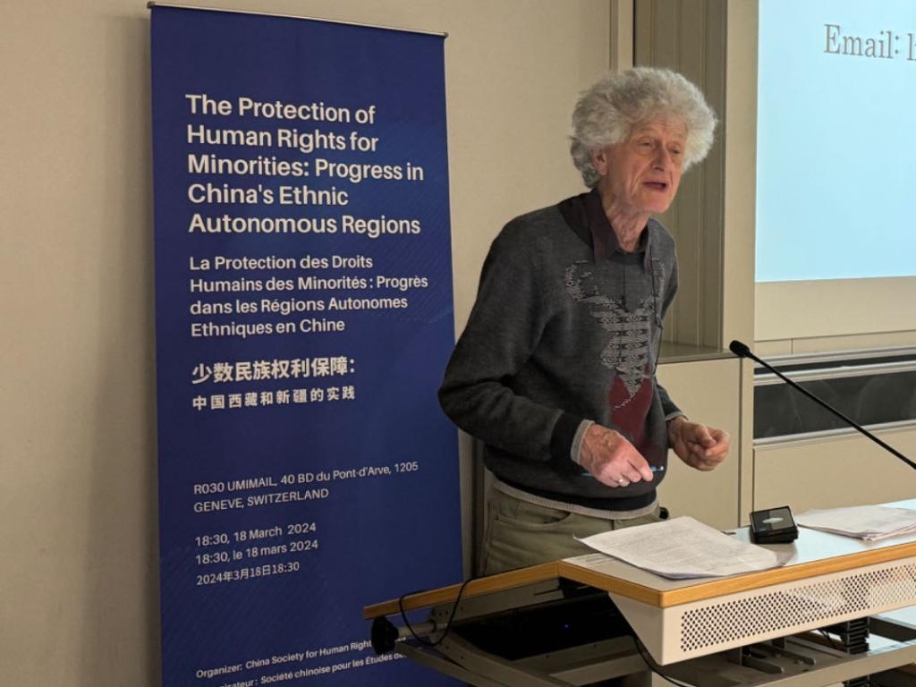 3月18日,由中國人權研究會主辦的“少數民族權利保障:中國西藏和新疆實踐”主題講座在瑞士日內瓦舉行。圖為比利時知名藏學家安德烈·拉克魯瓦在講座上發言。新華社記者石松攝