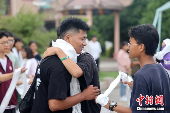 2022年6月,江蘇省南通市,南通西藏民族中學高三畢業生在離別前與校友告別。徐培欽 攝