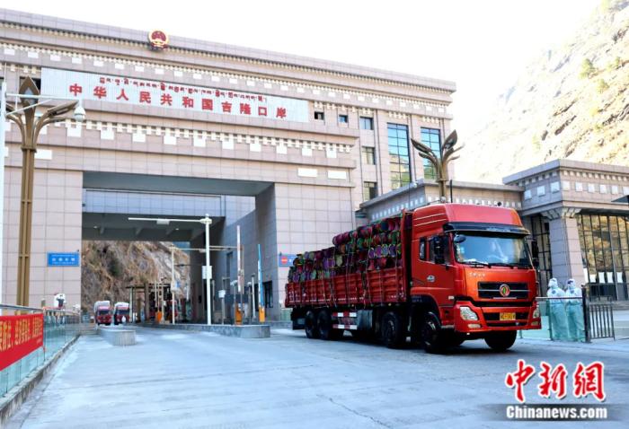 貨車駛入位于西藏自治區吉隆縣的吉隆口岸。吉隆融媒體中心 供圖