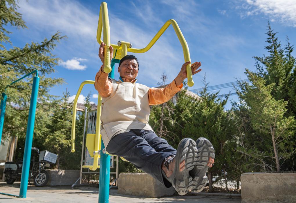普次仁在小區健身(3月23日攝)。新華社記者 丁增尼達 攝