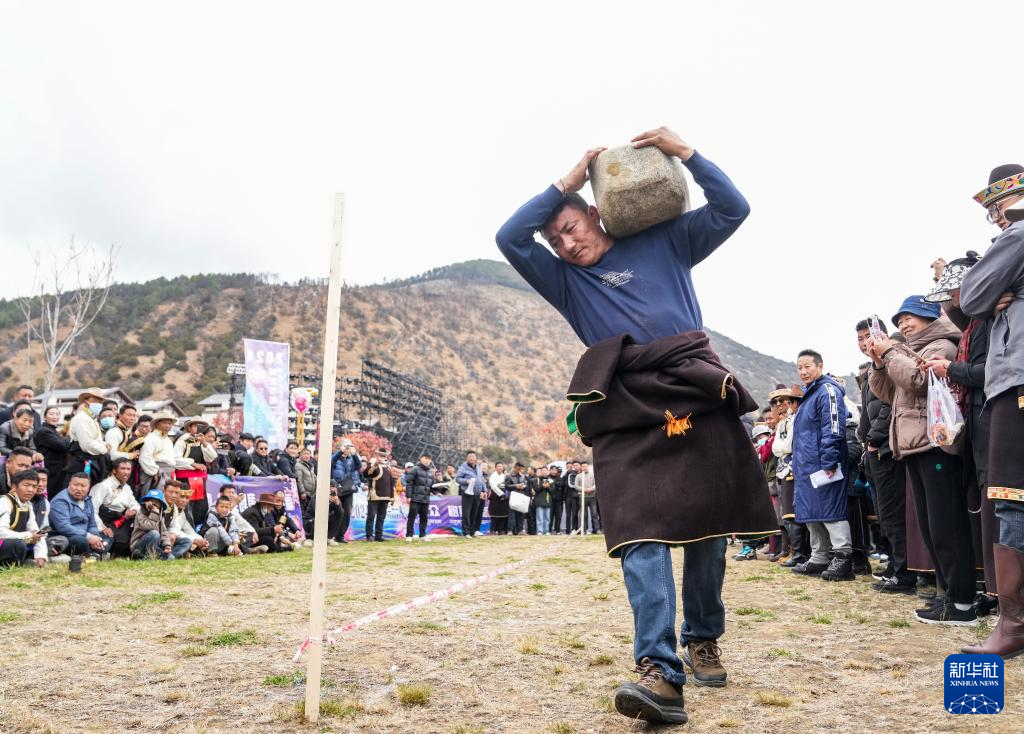 3月31日,在林芝市第二十一屆桃花旅游文化節民俗體育活動中拍攝的抱石頭比賽。新華社記者 丁汀 攝
