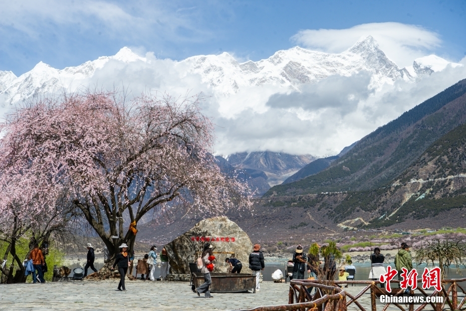 圖為游客在桃花樹下觀賞南迦巴瓦峰美景。中新社記者 貢嘎來(lái)松 攝