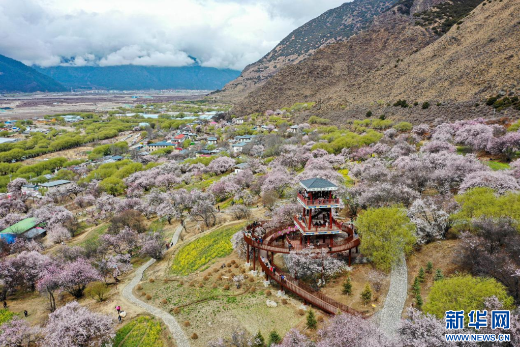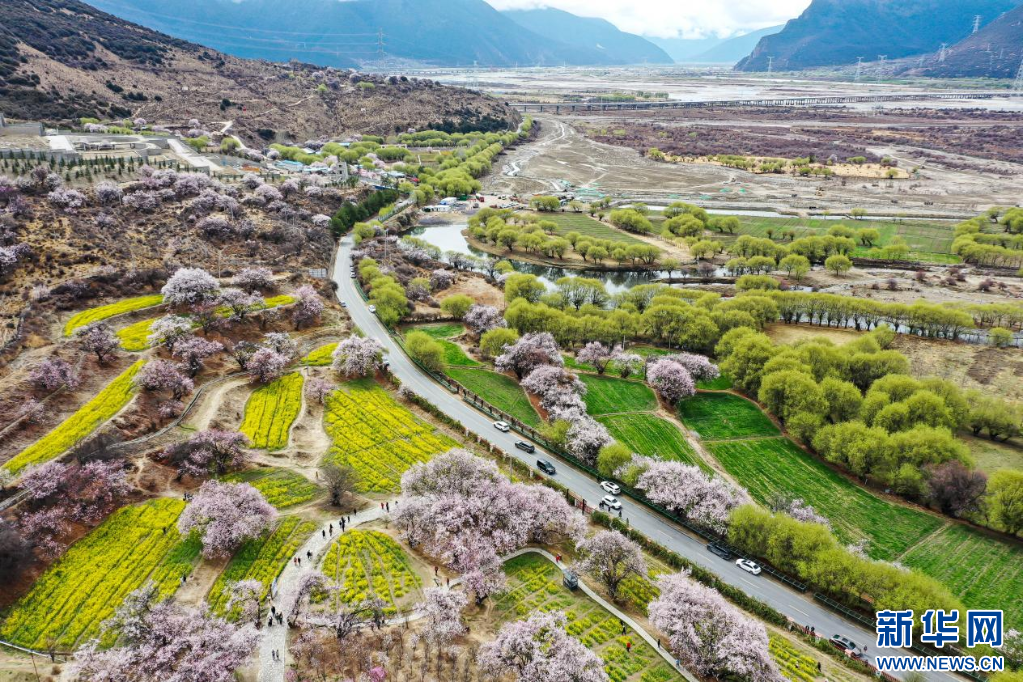 3月31日,林芝市巴宜區嘎拉村盛開的桃花(無人機圖片)。新華網發 李騰 攝