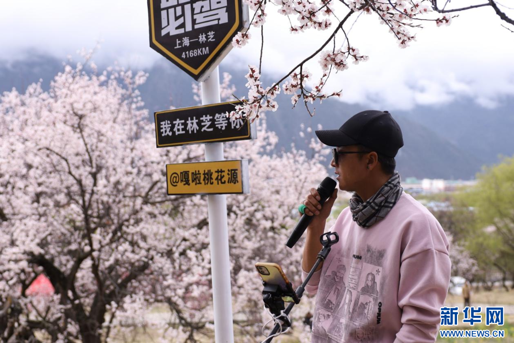 3月31日,游客在林芝市巴宜區嘎拉村進行線上直播。新華網發 李騰 攝