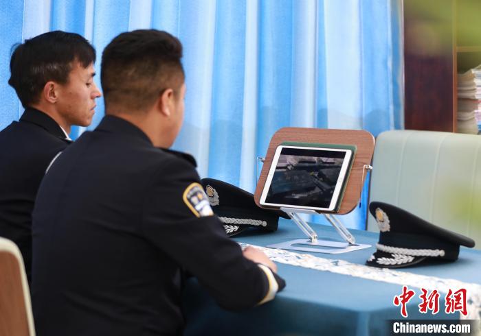 圖為移民管理警察旺青格列與海關緝私警察米瑪次仁觀看革命英烈宣傳片《犧牲在黎明》。肖富貴 攝