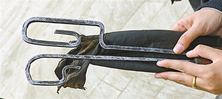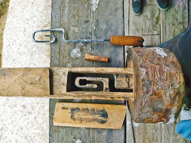 如此精致巧妙的木鎖怎么制作?我們又驅車來到了八蓋鄉巴瑞村,采訪了八蓋木鎖的第六代傳人次久羅布。他告訴我們,制作木鎖,首先要選一整塊的樺樹木,最好是結疤木,按照鎖的要求,用斧頭、鑿子將木頭削成圓形的鎖面和長方形的鎖芯,將鎖面和鎖芯之間掏空,留出鑰匙孔。在長方形的鎖芯中鑿出需要鑰匙進入的形狀,直至孔道與鑰匙嚴絲合縫。再將青岡木制成的栓子放進鎖芯前端被掏出的小孔中,并為鎖面覆上一層木板。這樣,一個木鎖便大致完成了。