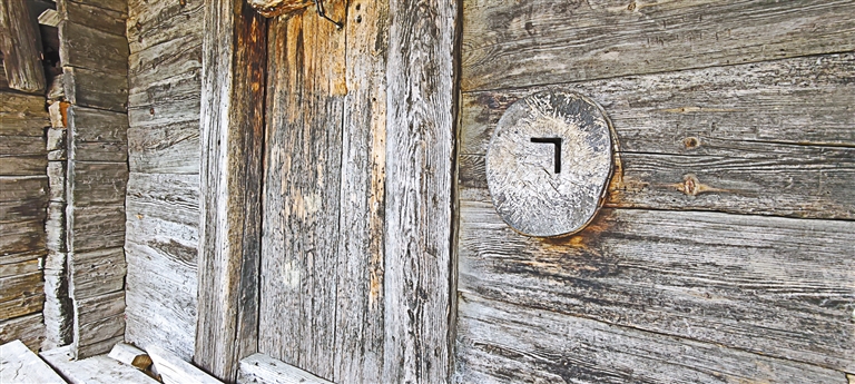 在村民的幫助下,我們依著鎖孔的形狀,將鑰匙平放進去,沉進鎖芯的孔道中,憑感覺挑起用小木塊做成的栓子,把沉重的木鎖從門邊的鎖洞中移除。接著,再用手伸進鎖洞中摸索著移動房門后的木栓,即內鎖,多次嘗試后終于打開了一間糧倉!