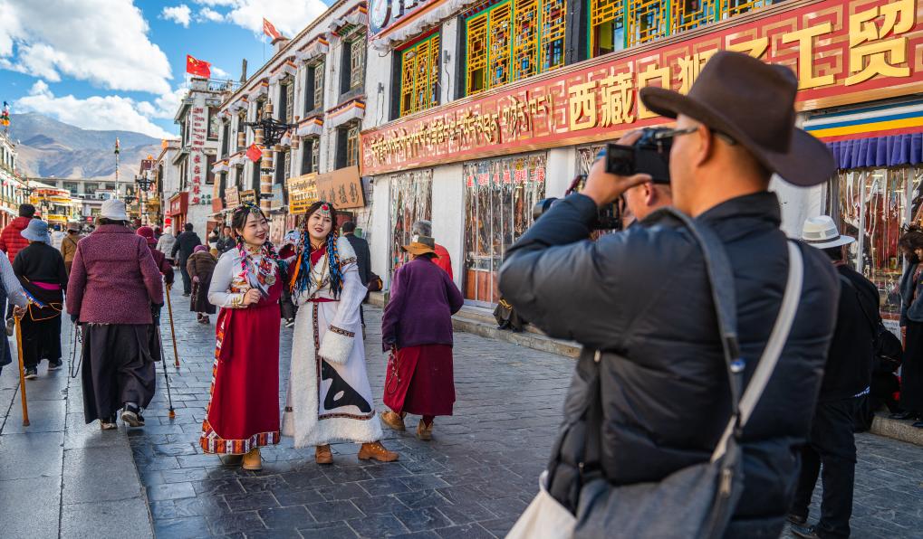 游客在八廓街街道上拍照留念。新華社記者 丁增尼達(dá)攝