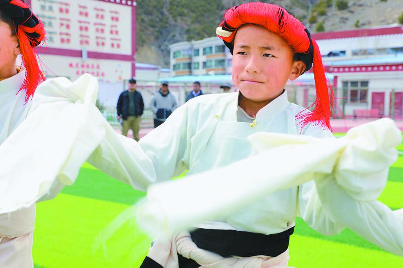 圖為認真排練“索榮卓舞”的若達鄉小學學生。記者 曲珍 通訊員 益西卓嘎 攝