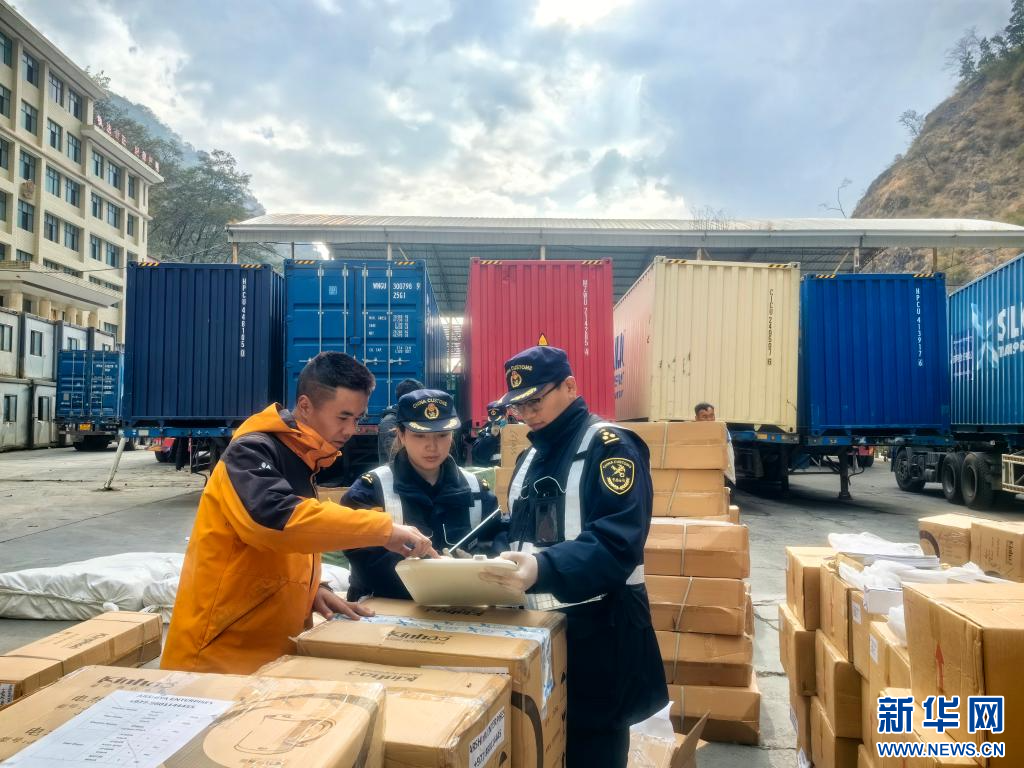 拉薩海關所屬聶拉木海關工作人員監管進出口貨物。(拉薩海關供圖)
