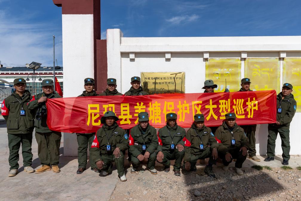 野生動物專業管護隊員出發巡護前在尼瑪縣縣城的羅布玉杰管護站合影(5月7日攝)。新華社記者 姜帆 攝