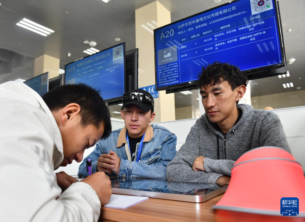 5月24日,在招聘會現場,求職者(左)在給用人單位填寫個人資料。新華社記者 晉美多吉 攝