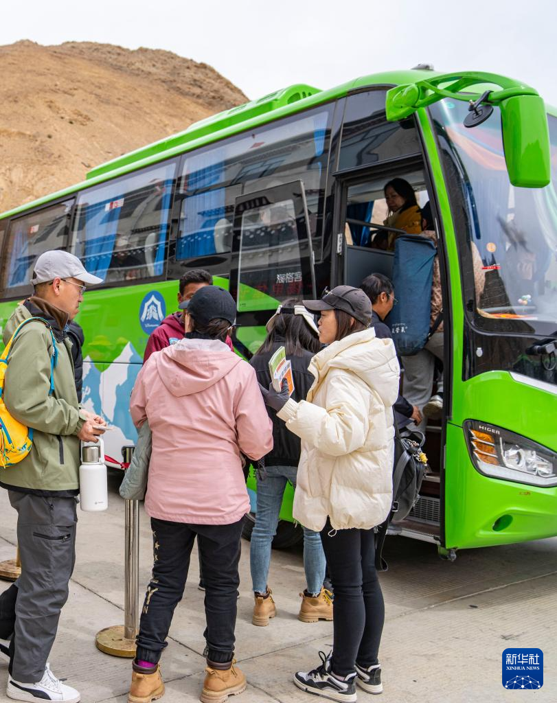 游客在珠穆朗瑪國家公園內排隊換乘環保大巴車(5月20日攝)。