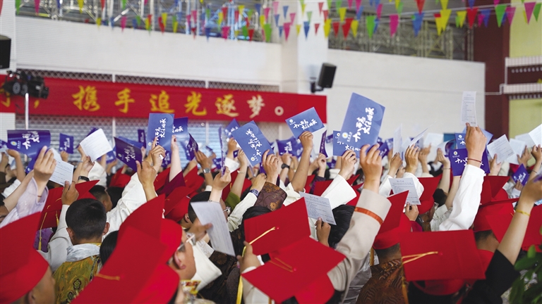 活動(dòng)現(xiàn)場(chǎng),每一位即將畢業(yè)的學(xué)生都要穿過(guò)象征著“成人、成才、成功”的三道門。家長(zhǎng)代表手捧鮮花,不停地叮囑著孩子;老師們眼眶濕潤(rùn),看著即將離校的學(xué)生,充滿了不舍和期待。此刻,千言萬(wàn)語(yǔ)涌入心間,匯成美好的期盼。