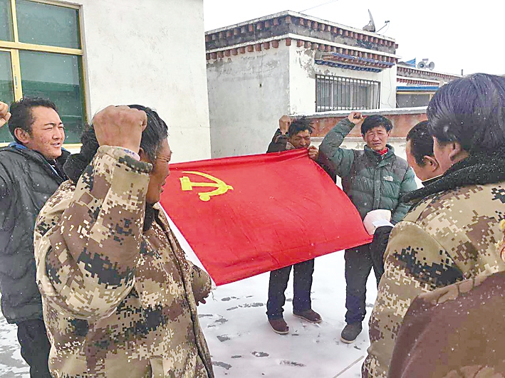 中國電信西藏公司駐霍爾巴鄉駐村工作隊與聯系點黨員干部重溫入黨宣誓。