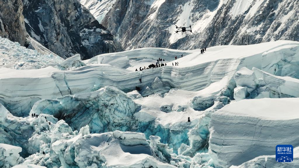 4月30日,大疆運載無人機在珠穆朗瑪峰南坡昆布冰川進行物資運輸測試(視頻截圖)。新華社發