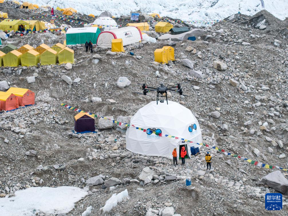 4月30日,大疆運載無人機在珠穆朗瑪峰南坡大本營進行物資運輸測試(視頻截圖)。新華社發