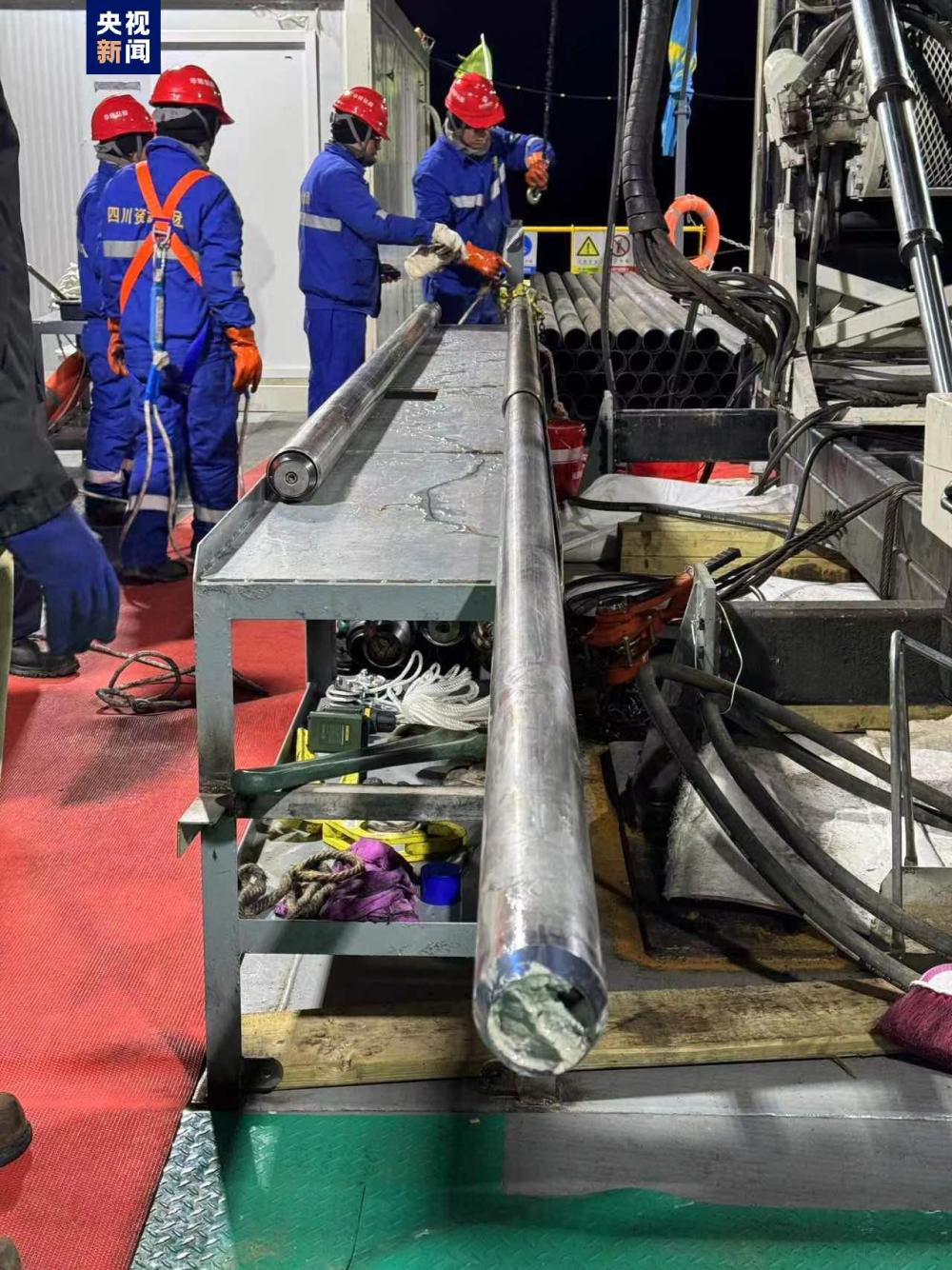 6月6日作為鉆芯的第一天,經過不斷地調整和試驗,當晚23時20分,第一次正式鉆探開始,鉆頭深入到了水下95米左右的位置,在第一個點位開始鉆取湖泊巖芯。23時40分,科考團隊獲得了第一批湖泊巖心樣本。科研團隊每次鉆取3米一段,通過24小時輪班不間斷作業,截至7日早6時,已獲得9米長的巖芯。