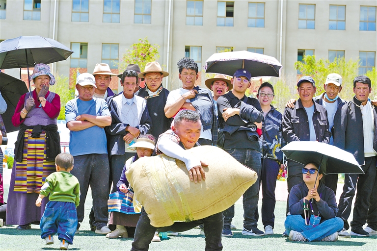 桑珠孜區城北街道舉辦慶祝第八個“日喀則市民族團結進步日”暨“全民來健身 健康你我他”社區運動會。這是參賽選手在進行抱石頭比賽。