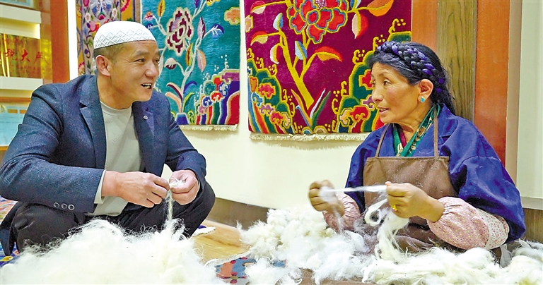 江孜縣組織開展民族文化、民族手工業、民族飲食、民族服裝等沉浸式體驗活動。這是回族群眾在體驗傳統服裝制作工序。