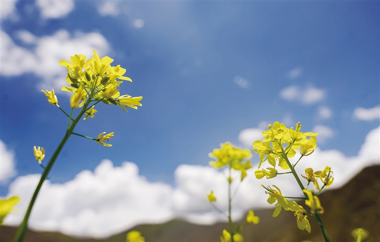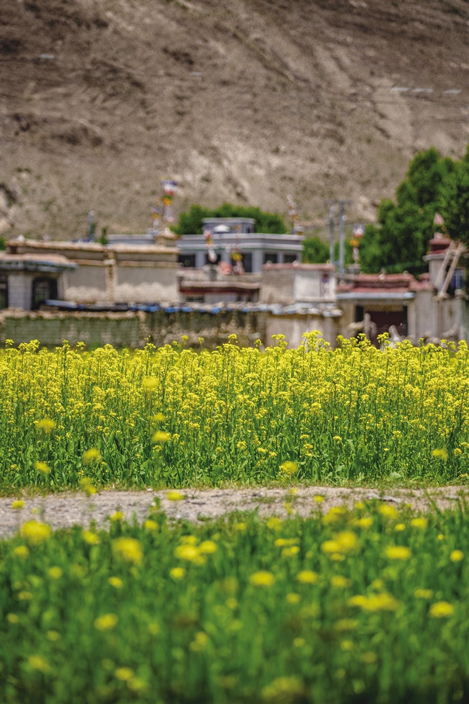 西藏的春天可以欣賞桃花,夏天可以欣賞什么花?那當然是油菜花。近期,西藏各地迎來了油菜花盛開的季節。行走在夏日的農田里,金黃色的油菜花給綠意盎然的農田增添了幾分色彩。放眼望去,在藍天白云的映襯下,油菜花海如同金黃色的毯子般鋪展開來,花海在微風中輕聲搖曳,與一旁的道路、錯落有致的村居共同構成了一幅和諧美麗的田園風景圖。