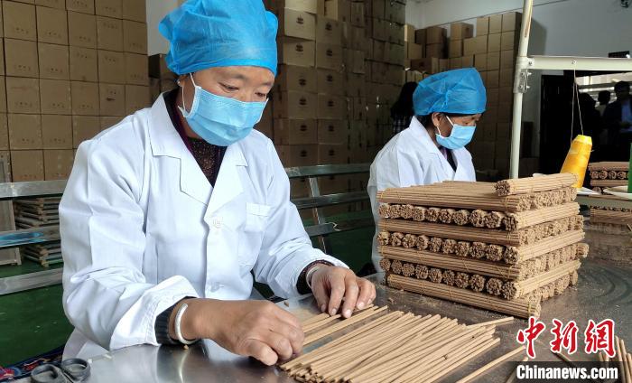 “我們農閑時就會來這里制作藏香?!睅孜宦耦^工作的婦女不善言談,但她們數線香、捆藏香流程十分嫻熟,她們足不出村實現就業增收。