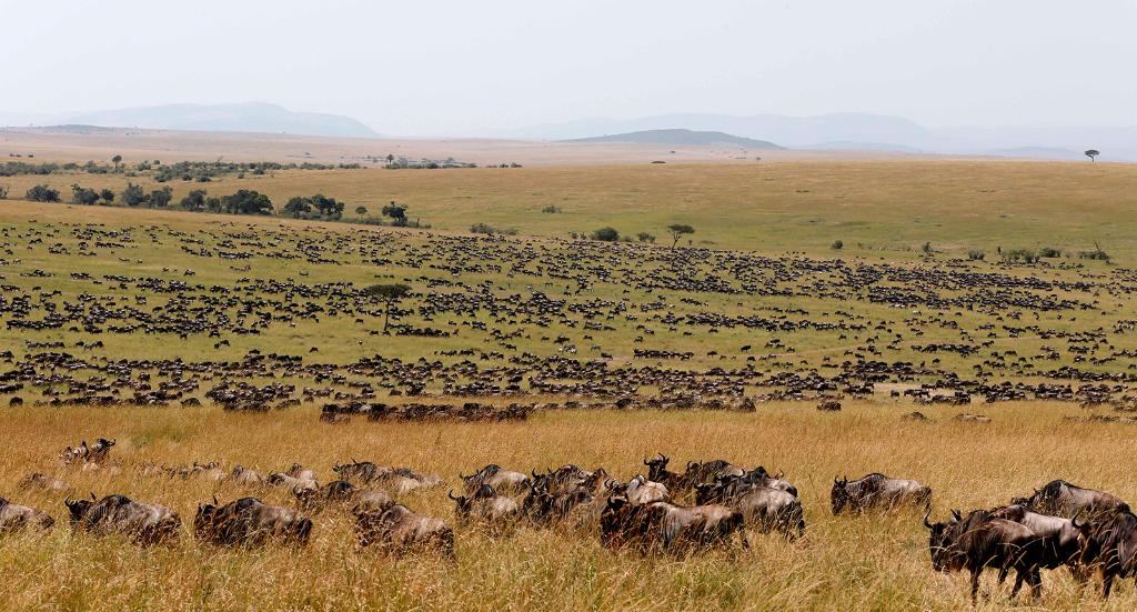 ↑ 在馬賽馬拉國家保護區,遷徙中的野生動物在草原上覓食。
