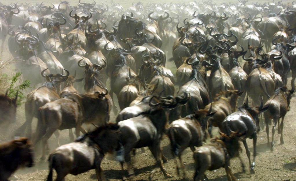 ↑ 在馬賽馬拉國家保護區,遷徙中的角馬因為感受到某種危險而奮力奔跑。